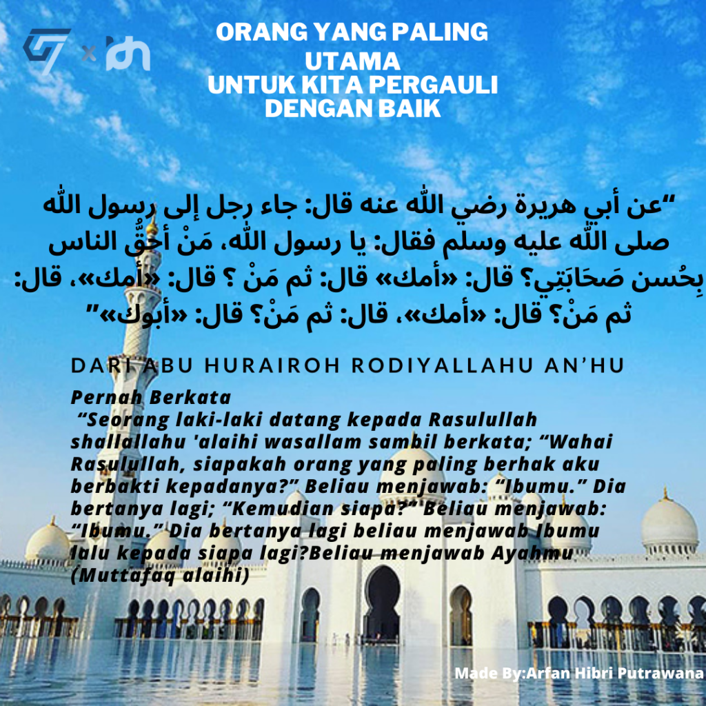 Tinggalkan Komentar / Oleh AdminPanzz / 22 September 2023 Assalamualaikum My name is Arfan and this is one of my diniyah projects, namely hadith posters. The hadith listed in the picture is the hadith of the person with whom we have the most right to associate Tools:Canva