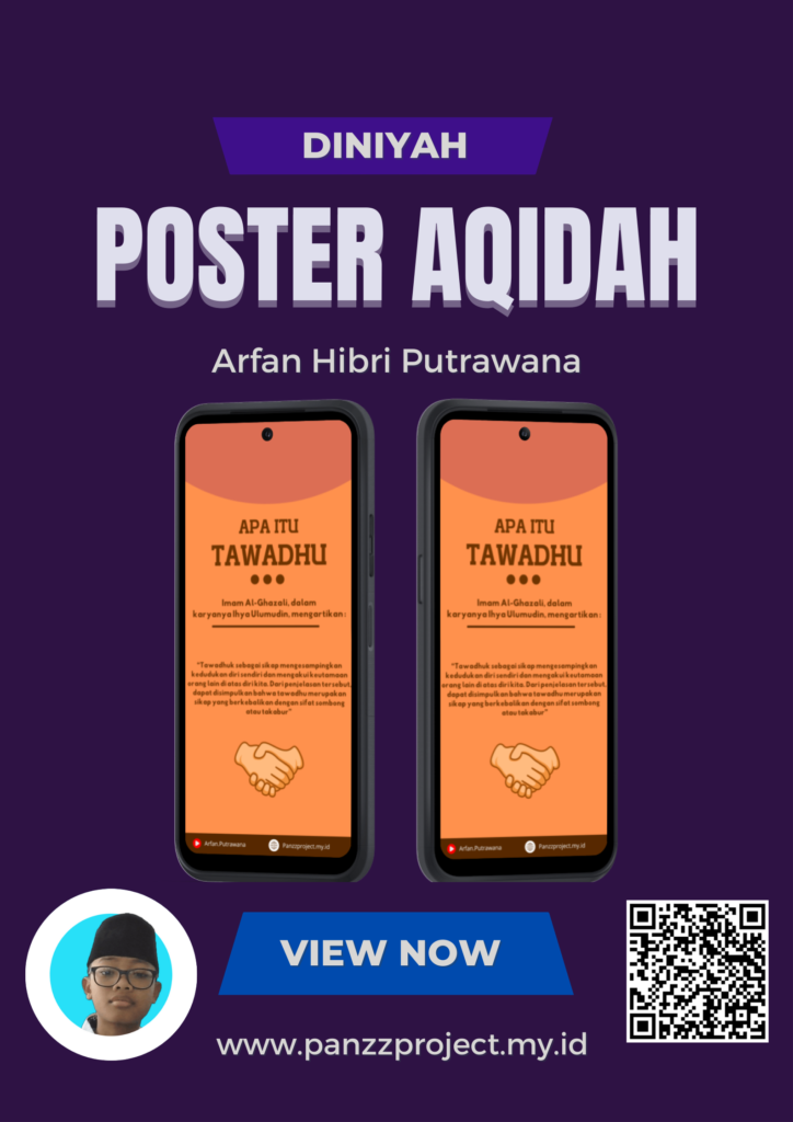 Tinggalkan Komentar / Oleh AdminPanzz / 23 Mei 2024 Diniyah Aqidah Poster Poster Assalamualaikum Introducing my name, Arfan H.P. From class 7C and this time I want to show you one of Diniyah's projects in semester 2, namely the project to make a poster about Aqidah. In this project, I made a hadith poster entitled "Tawaduk"